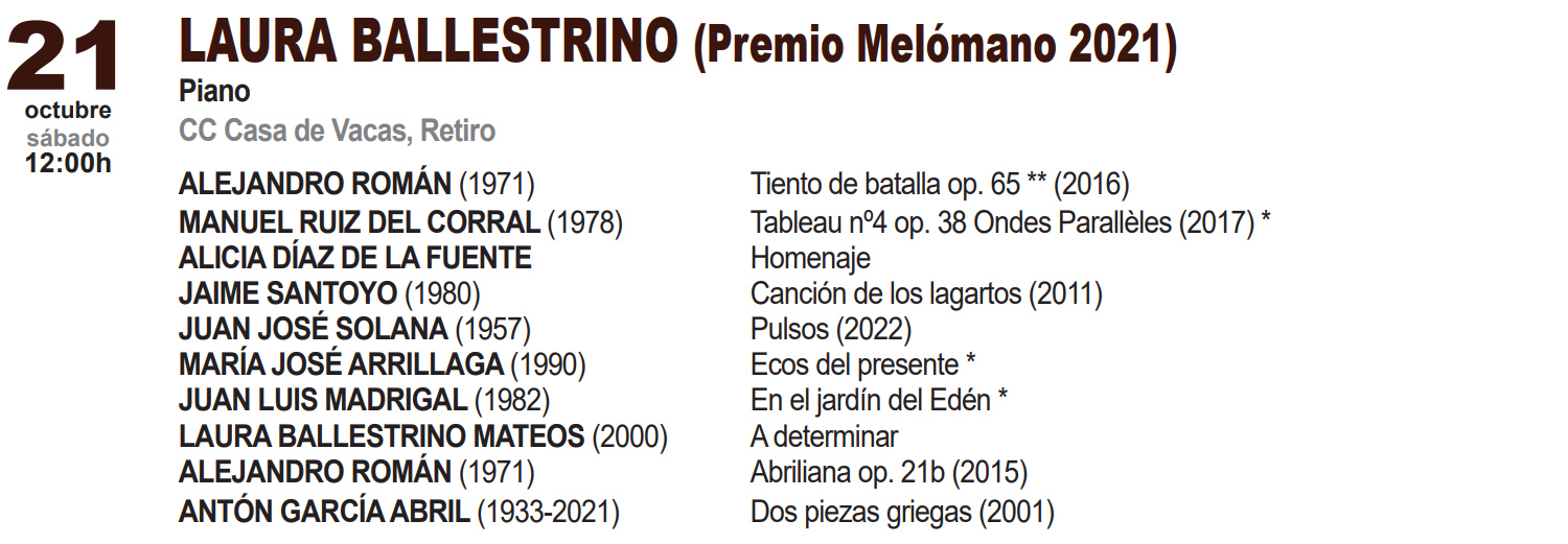 (Madrid, 2000). Pianista y compositora española. Actualmente es una de las grandes promesas de la música en España, galardonada en prestigiosos concursos nacionales e internacionales como el primer premio en Juventudes Musicales de España, María Herrero y Gran Klavier, además de premios especiales en CIPCE e Intercentros Melómano. Ha realizado giras y ofrecido conciertos por toda España, incluyendo algunas de las salas y festivales más relevantes del país.