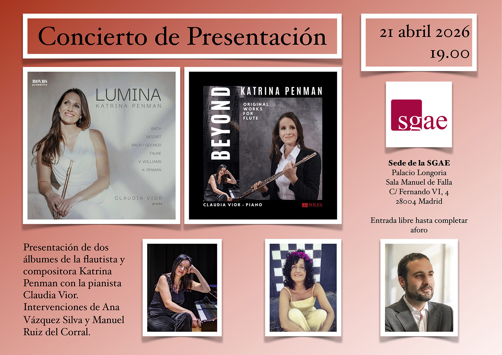 El martes 21 de abril a las 19.00, se presentarán en la Sala Manuel de Falla de la SGAE dos álbumes de la flautista y compositora Katrina Penman (socia de la AMCC) con la pianista Claudia Vior. El concierto de presentación será acompañada por un coloquio donde intervendrán la compositora Ana Vázquez Silva y Manuel Ruiz de Corral, director del sello Novus Promusica.